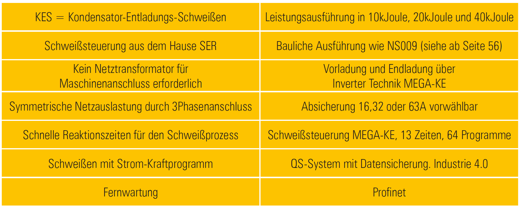 Mit dem KE-Schweißen können Werkstücke unterschiedlicher Materialdicke aus verschiedenen Werkstoffen geschweißt werden. Auch legierte Edelstähle, hochkohlenstoffhaltige oder gehärtete Werkstücke lassen sich mit dem Verfahren verbinden. Es wird beim KE-Schweißen kaum Wärme in das umgebende Material und die Elektroden abgegeben, wodurch eine Wasserkühlung nicht notwendig ist.
