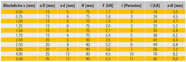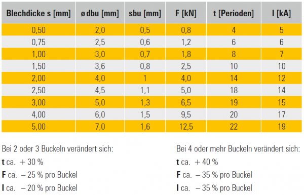 Richtwerte für Buckelschweißen von Stahlblech mit max. 0,28 % C