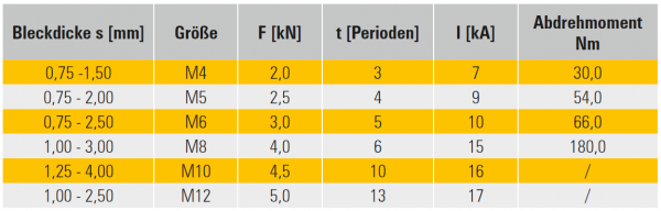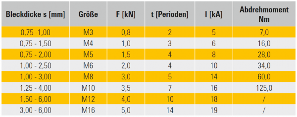 Richtwerte für Sechskantmutter DIN 929 auf Stahlblech mit < 0,28 % C